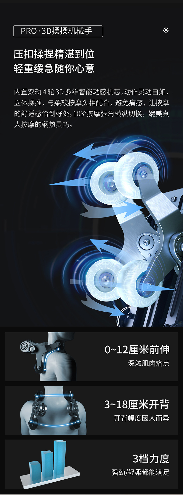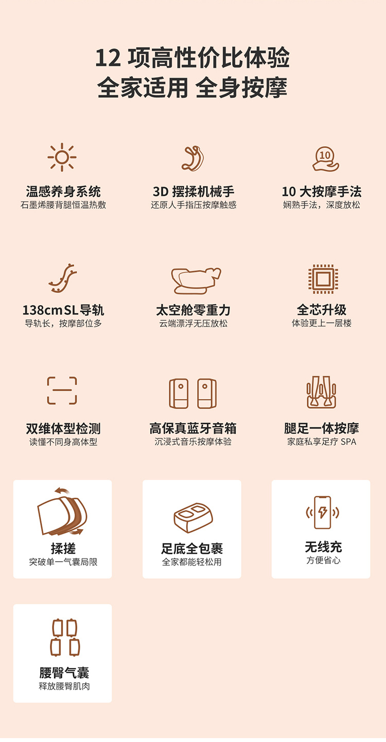 锐珀尔集十余年技术积累,倾力打造锐珀尔新款按摩椅4D穴感总裁椅,拥有全新的AI智能语音,小腿温热揉搓、脚底震动、4D机械手等全新功能创新,智能健康体测,可以检测血氧、心率、微循环等数值,通过大数据分析,给您提供合理的改善方法,时刻关注您的健康状况;超大液晶智能触控,专为总裁量身打造的特色按摩程序,20分钟快速补充精力,多种按摩程序,满足全家人的需求。