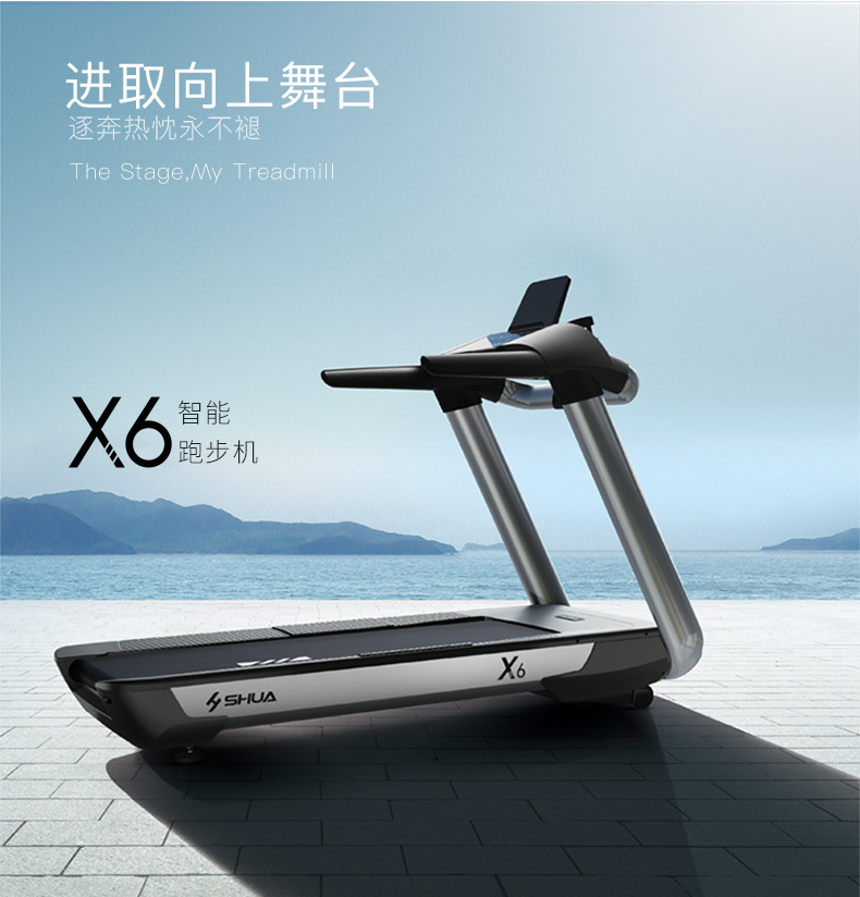 锐强体育推荐健身器材-舒华商用电动跑步机SH-T6500拥有10.1寸IPS高清触摸屏、Z型动感时尚外观设计、70×150mm精钢立柱机身、F级高效静音马达、520mm商用豪华跑带和35mm双层全跑台减震跑板等优势,让您享受科学跑步。